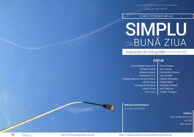 De multe ori suntem inundați de consumerism, ne simțim sufocați de prea multul din jurul nostru, uneori ne este puțin dificil să mai luăm aminte la ce este important pentru noi, fapt ce ne influențează viețile pe toate planurile și nu neapărat în mod pozitiv. Aproape jumătate dintre membrii Clubului Fotografilor Iași s-au gândit să organizeze o expoziție ce vizează tema curentului minimalist. Ne dorim ca prin această expoziție să schimbăm ceva în perspectiva privitorilor și admiratorilor, să reușim să vedem, nu excesul, ci esențialul, ideile mai bine conturate, amintirile frumoase, valorile, liniștea sufletească și mentală. Vă așteptăm la vernisaj, pentru o mică incursiune în simplitate și esență, dar și pentru a ne reaminti cum să păstrăm doar ceea ce contează cu adevărat.