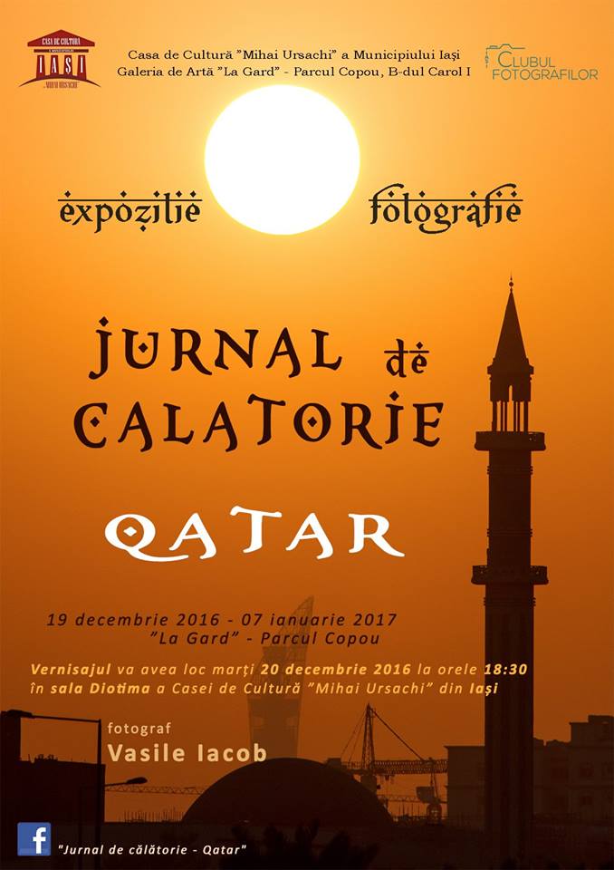 “Expoziția de fotografie ”Jurnal de călătorie – Qatar” prezintă în 60 de imagini o zi din viata unuia din statele Orientului Mijlociu, Qatar. Sunt fotografii surprinse în aproximativ un an de zile din zona Doha si vecinatati. Fotografiile sunt panotate cronologic, iar numele acestora reprezintă locul unde au fost surprinse și ora. Un an intr-o zi și 60 de imagini.”