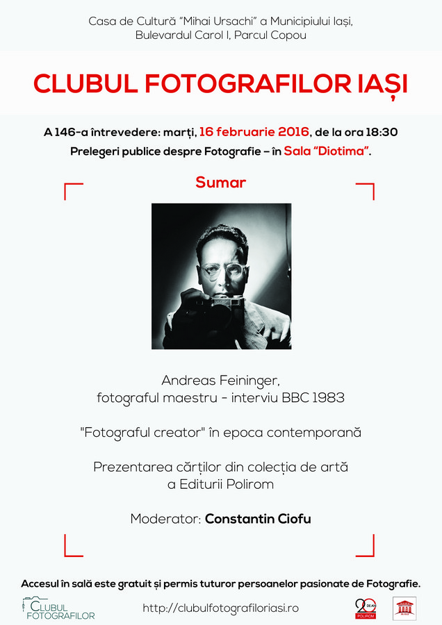 La Casa de Cultură „Mihai Ursachi” a Municipiului Iaşi a avut loc marţi, 16 februarie 2016, cea de-a 146-a întrevedere a Clubului Fotografilor Iaşi. Întâlnirea a fost dedicată fotografului american de orifine germană Andreas Feininger şi s-a bucurat de prezenţa unui număr mare de membri ai Clubului Fotografilor Iaşi dar şi a pasionaţilor de fotografie din Iaşi.