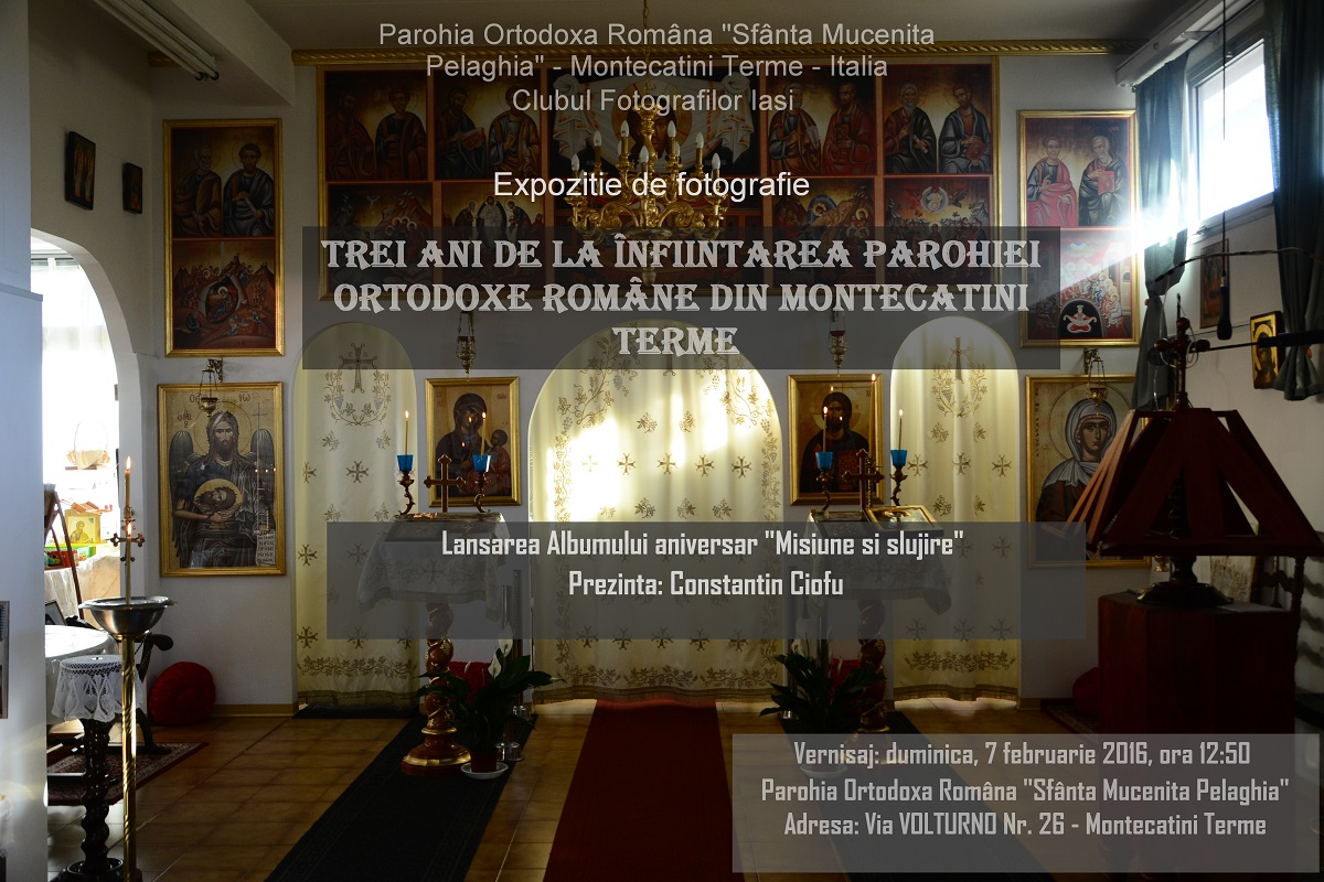 În Parohia Ortodoxă „Sfânta Pelaghia” – Montecatini Terme – Italia a fost vernisată astăzi, 7 februarie 2016, expoziţia de fotografie aniversară „Trei ani de la înfiinţarea Parohiei Ortodoxe Române din Montecatini Terme”.
