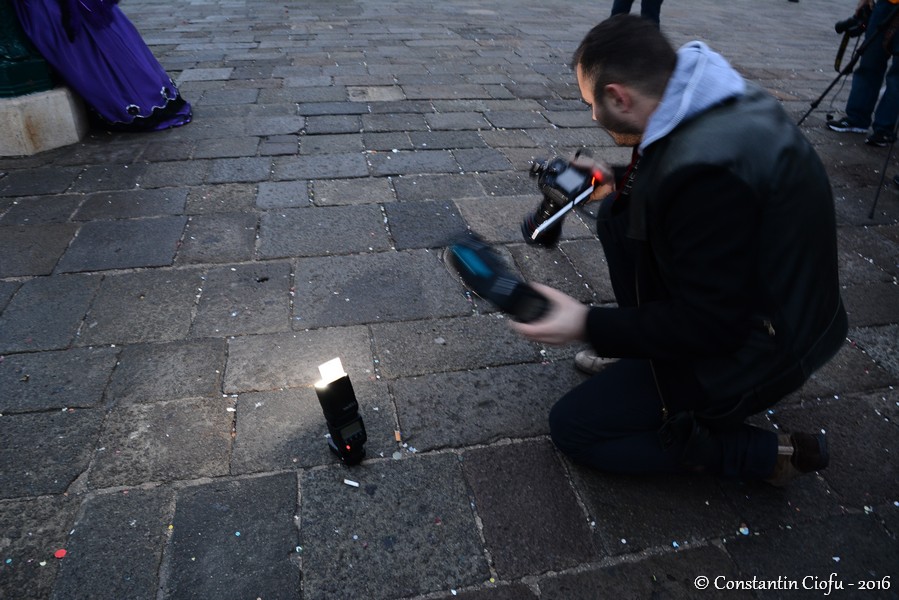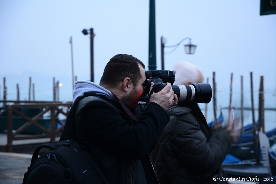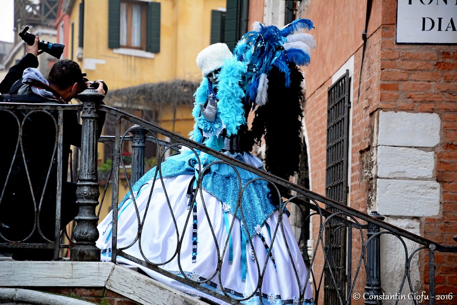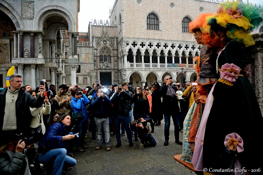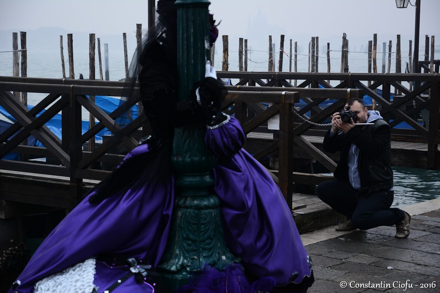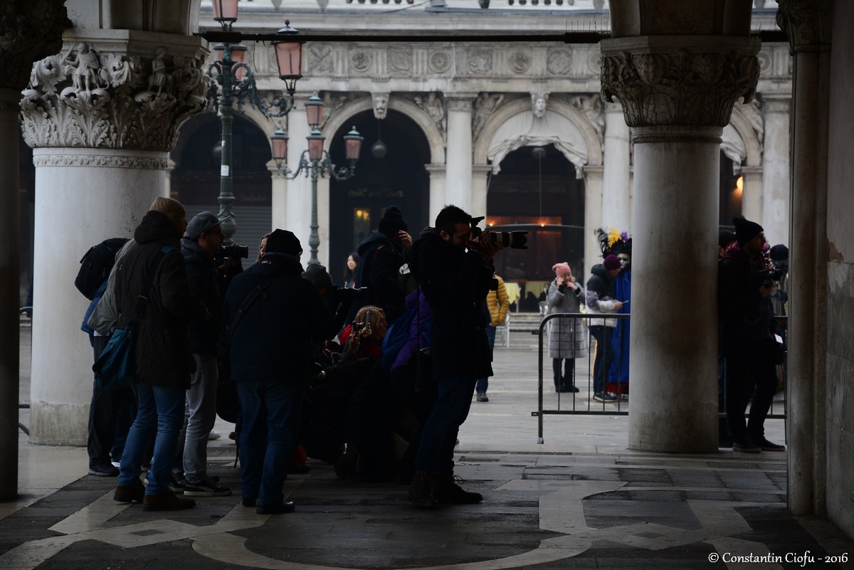 Veneţia este în aceste zile cel mai mare studio foto din lume. Măştile îşi fac apariţia discret şi grandios, fiind „împuşcate” de aparatele foto. Ne-am întrebat de unde au atâta răbdare să stea ore în şir în faţa obiectivelor. Din când în când poţi observa dialogul dintre fotograf şi personaj, iar alteori măştile sunt răpite. Sunt purtate în cele mai misterioase locuri şi aşezate în aşa fel încât să iasă în evidenţă cât mai mult culoarea şi frumuseţea costumelor. Mulţi fotografi, îndrăgostiţi de fotografia de studio, se simt în aceste zile la Veneţia precum o pasăre lăsată să zboare din colivie. Toată lumea fotografiază, iar toată lumea se lasă fotografiată. Acum mă întreb câte dintre aceste fotografii vor mai exista peste un deceniu?